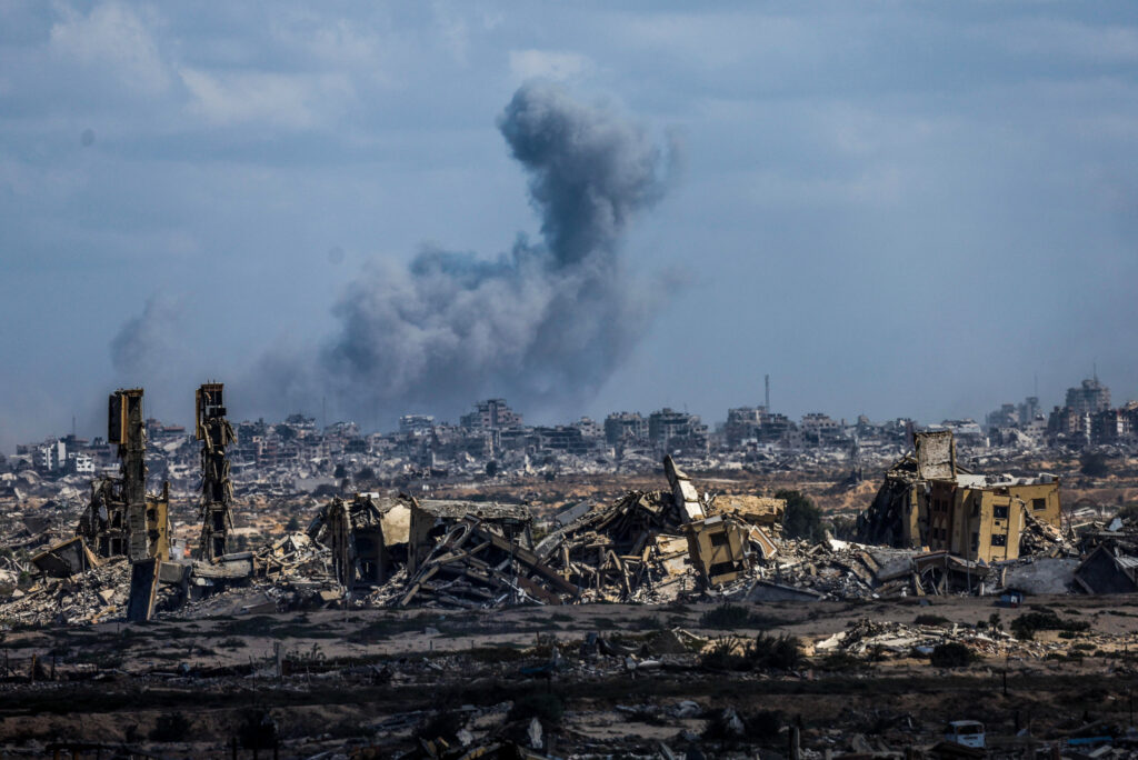 Smoke rises following an Israeli military strike in Gaza City, as seen from the central Gaza Strip, 6 Oct 2025. (Ali Hassan/Flash90)
