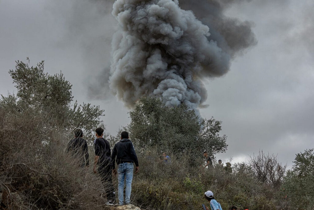 Palestinians watch smoke rising after a vehicle is set on fire by Israeli settlers during an attack on the first day of the olive harvest in the West Bank village of Beita, 10 Oct 2025.
