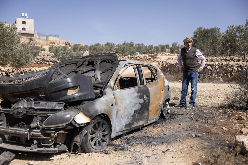 A Palestinian resident of Turmus Ayya stands beside a car burned the previous night during a violent settler attack, between Turmus Ayya and Al-Mughayyir in the occupied West Bank, 20 Oct 2025.  (Oren Ziv)