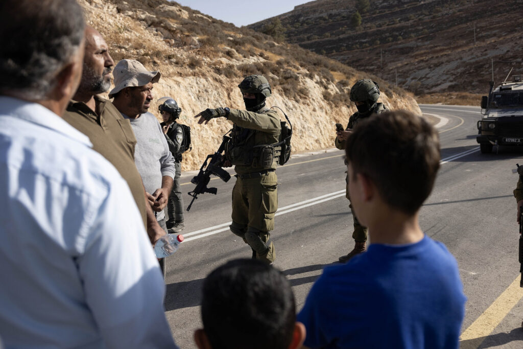 Israeli soldiers confront Palestinian farmers attempting to harvest olives on their land near the village of Sa’ir, in the occupied West Bank, 23 Oct 2025. (Oren Ziv)