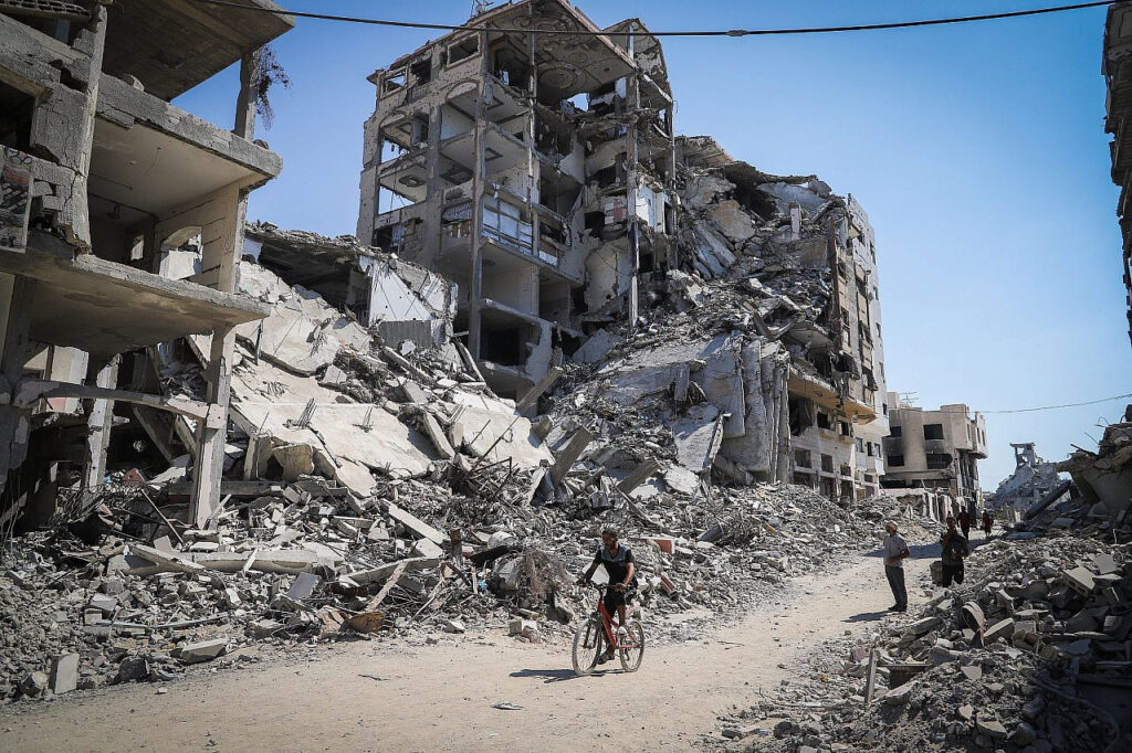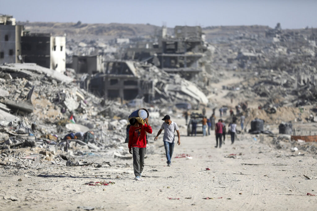 Palestinians walk among the ruins of their homes in the Shuja’iya neighborhood of eastern Gaza, 16 Oct 2025.  (Khalil Kahlout/Flash90)