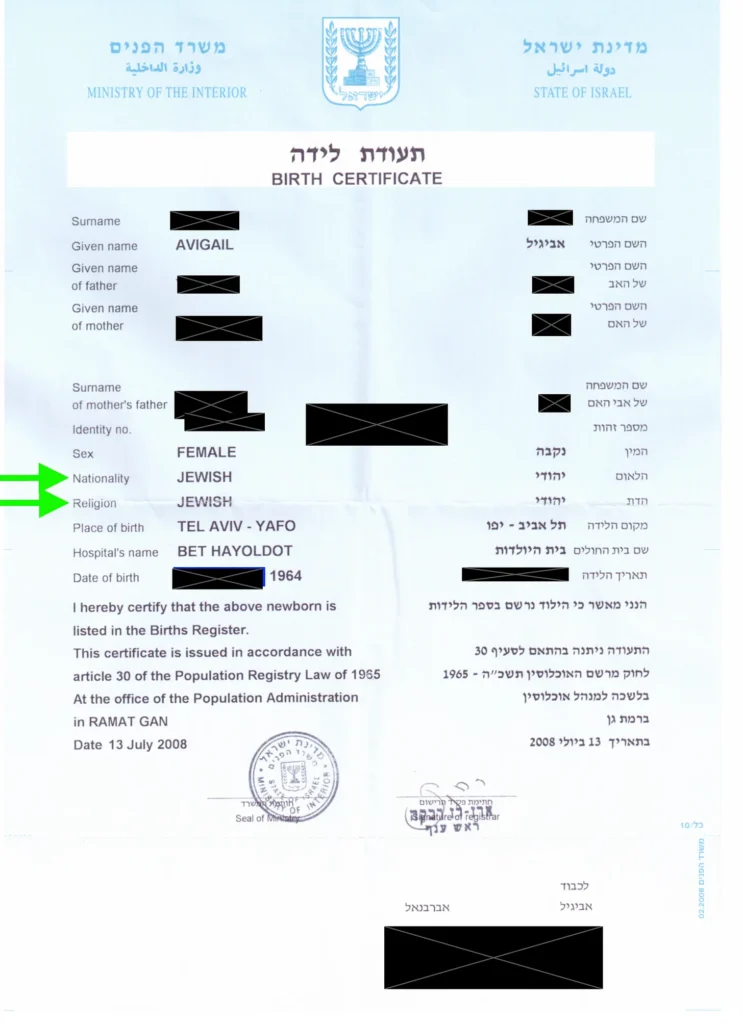 My birth certificate clearly shows Israel’s ‘racialisation’ of Jewishness. The word ‘nationality’ is euphemism for race. Israel cannot use the word ‘race’ in today’s world. The birth certificate of a Palestinian citizen of Israel says ‘Arab’ next to nationality, and it lists ‘other’ for anyone else born in Israel.