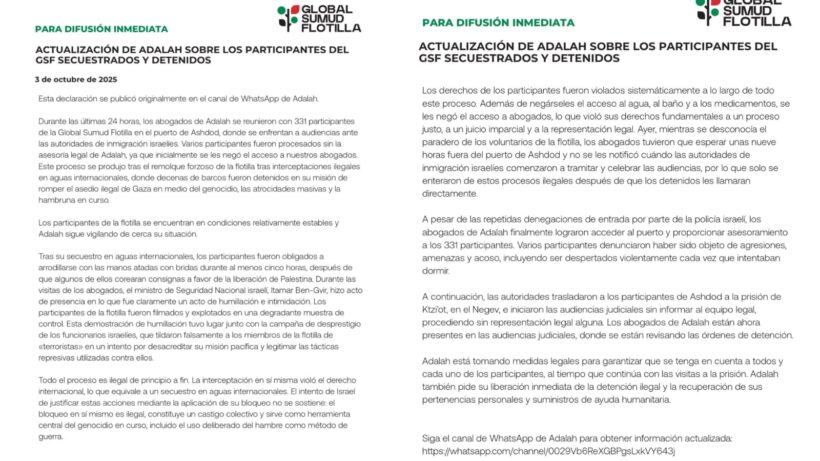 Over the past 24 hours, Adalah’s lawyers met with 331 participants of the Global Sumud Flotilla at the port of Ashdod, where they are facing hearings before Israeli immigration authorities. Several participants were processed without Adalah’s legal counsel, as access to our lawyers was initially denied. This process took place after the flotilla was forcibly towed following illegal interceptions in international waters, where dozens of boats were seized in their mission to break the illegal siege of Gaza amidst ongoing genocide, mass atrocities, and famine.