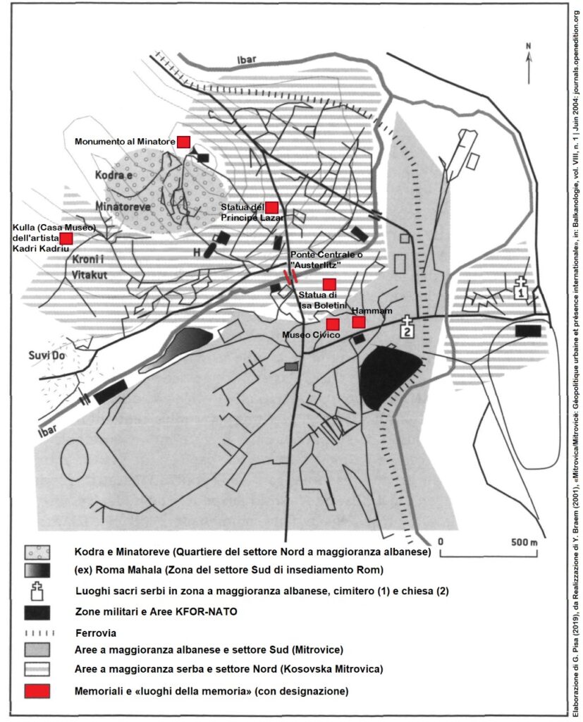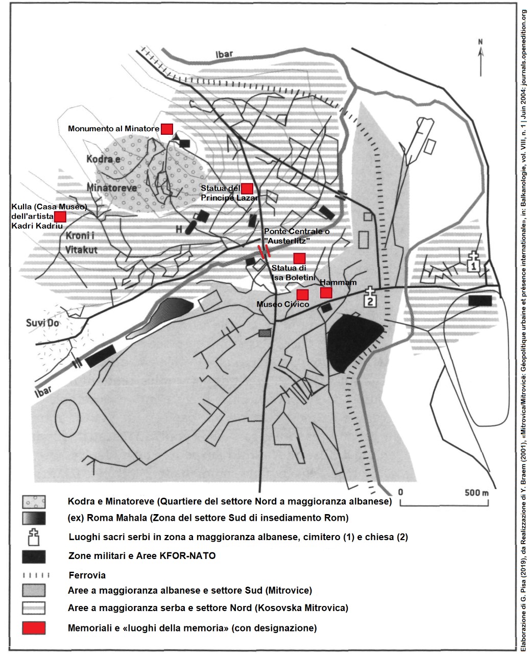 Fig. 4: The memorial topography of the city of Mitrovica (Kosovo), elaboration by Gianmarco Pisa (2019) based on a realization by Yann Braem (2001), «Mitrovica/Mitrovicë: Géopolitique urbaine et présence internationale», Balkanologie, v. VIII, n. 1 | 2004: https://doi.org/10.4000/balkanologie.515