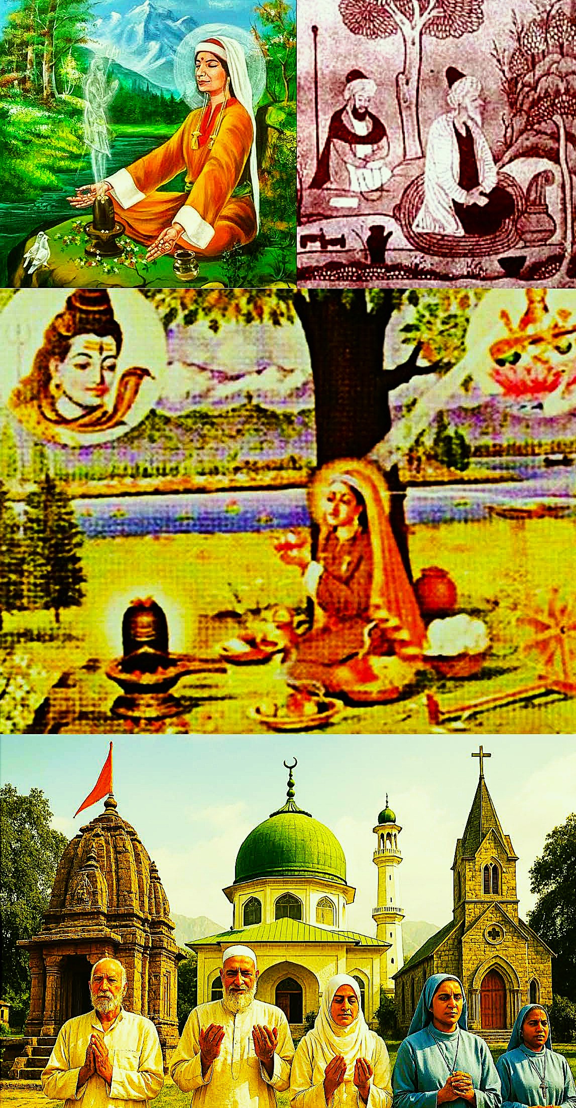 Photo Middle Row: The spiritual blessings from the Divine, graphically illustrated. Lal Ded’s Vakhs (poems) articulate a non-dualistic vision, urging individuals to look within to discover the divine essence that resides in all. One of her most famous verses captures this beautifully:“Shiva is everywhere, in the breath, in the void, in the heart. Seek Him not in temples, but in the mirror of your soul.”This emphasis on inner awakening over external rituals set Lal Ded apart from the religious dogmas of her time.