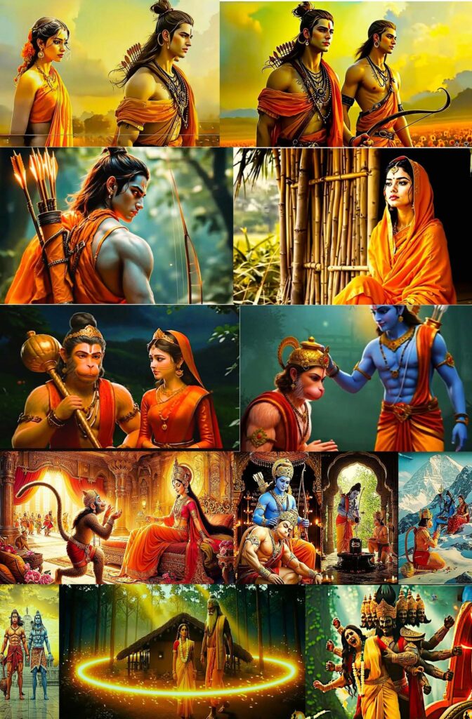 Phots Bottom Row, Left Lord Rama and Hanuman Ji, Photo middle Lord Rama’s Protection around Sita Devi, which she crossed to give alms to Ravana morphed into a guru, begging for food, when she transgressed Lord Rama’s instructions, not to cross the ring of protection. Photo Right: Tht abduction of Sita Devi by the multiheaded and muti upper limber transformed Ravana in his expression of a lustful state, while abducting Sita Devi.