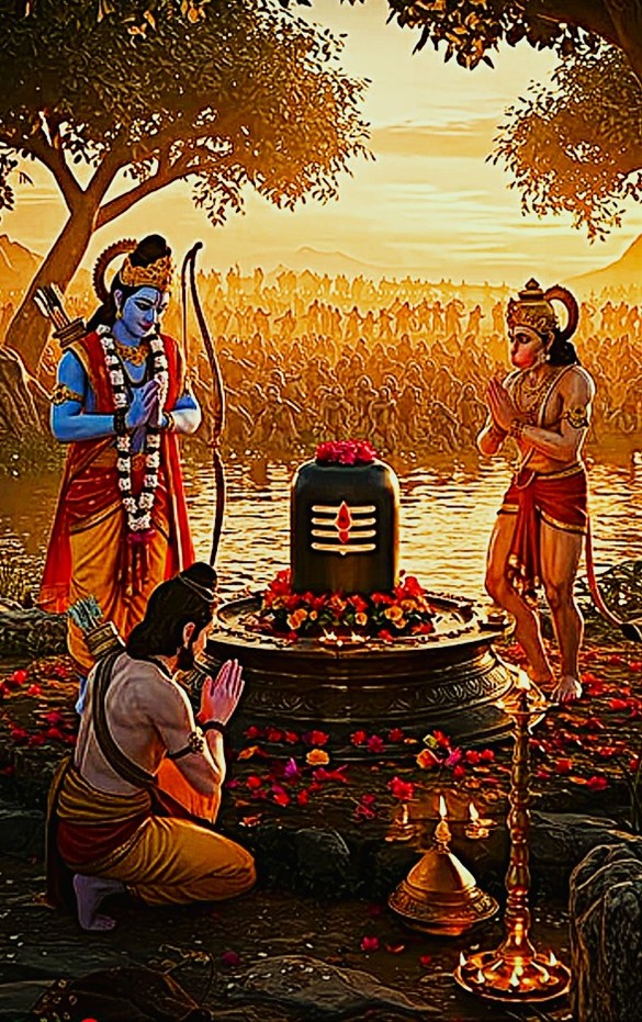 The highly spiritual scene of Lord Rama, praying to Lord Shiva’s Lingum along the Gunga River, with Lakshmana, Lord Rama’s step brother and Hanuman ji looking on with his monkey army awaiting further instructions for Lord Rama to initiate the Rescue of His abducted wife, Sita Devi, by Ravana, the evil King of Lanka. Photo Credit: Wikimedia Commons