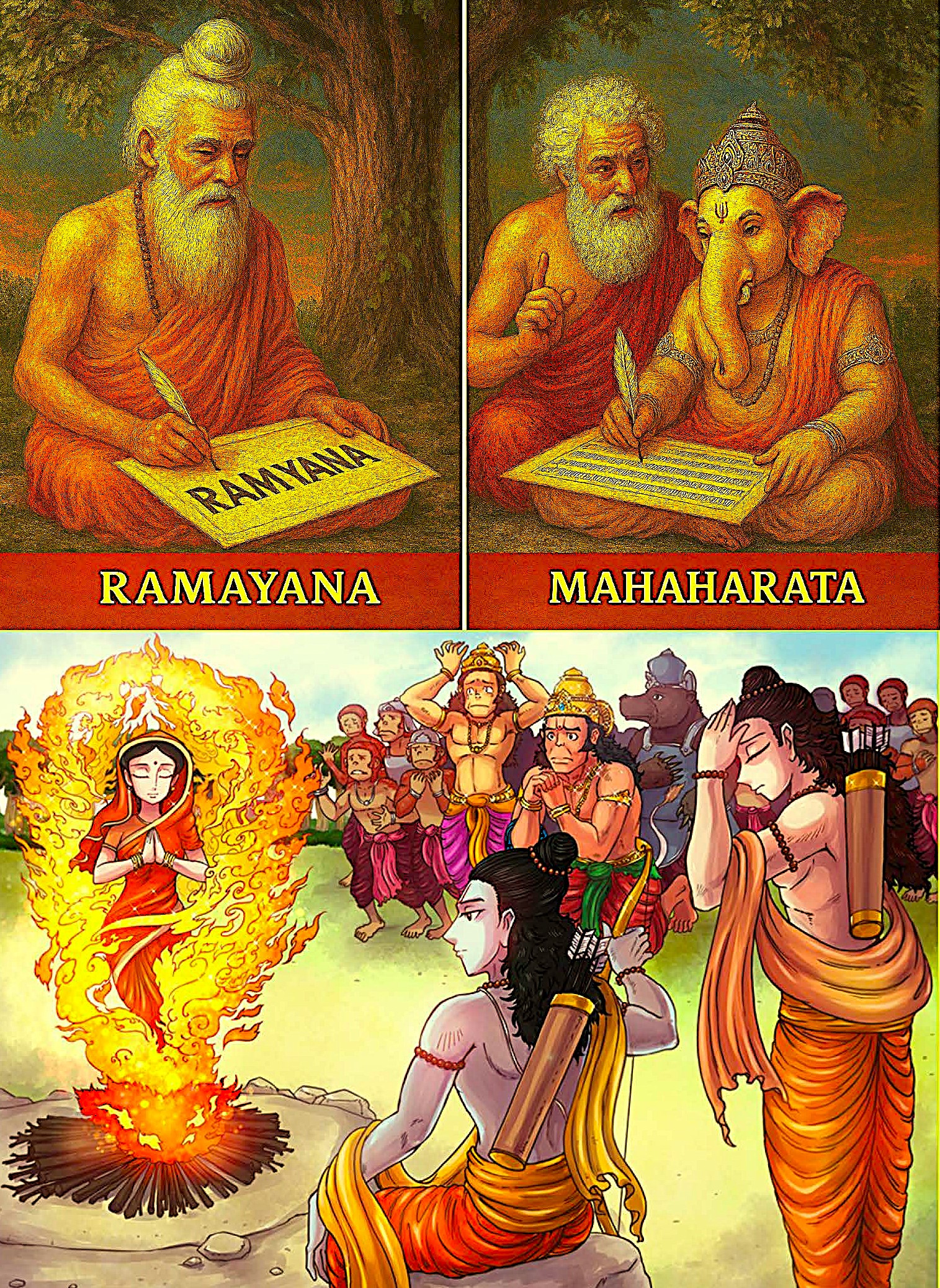 Photo Bottom:  The Agni Pariksha ordered against Sita Devi to prove her purity, watched by Rama, Lakshmana Hanuman, and thousands of Ayodhyians, as a public event in Ayodhya.