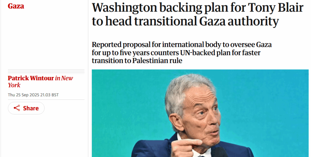 26 Sep 2025 – Yesterday saw two announcements. Starmer is to introduce compulsory digital ID cards in the UK, and Tony Blair is put forward by the White House to be the colonial administrator of Gaza for five years.