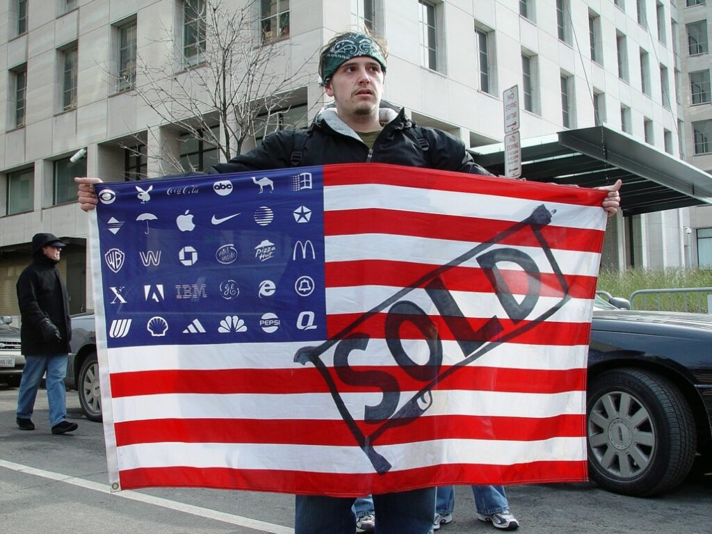 Un esempio di contestazione. Nella bandiera statunitense: le stelle sono sostituite da marchi di multinazionali; sulle strisce c’è scritto “venduta”.