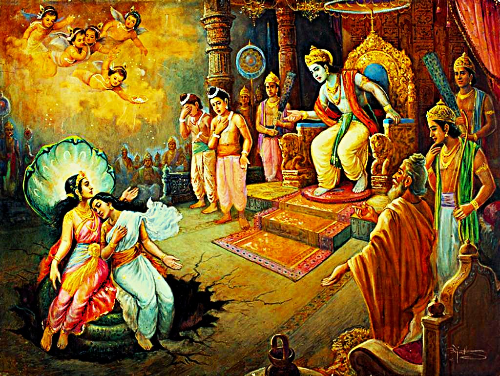The climax of Ramayana, in which Sita Sevi is welcomed by Bhumi Devi, following her intense supplications to Mother Earth, to remove her to an ethereal domain.  Sita Devi, is henceforth swallowed by Mother Earth, in the presence of all the good principals of Valmiki’s Ramayana.  The Bear, was also present on that occasion, together with Hanuman, who was in tears, with his varnas.