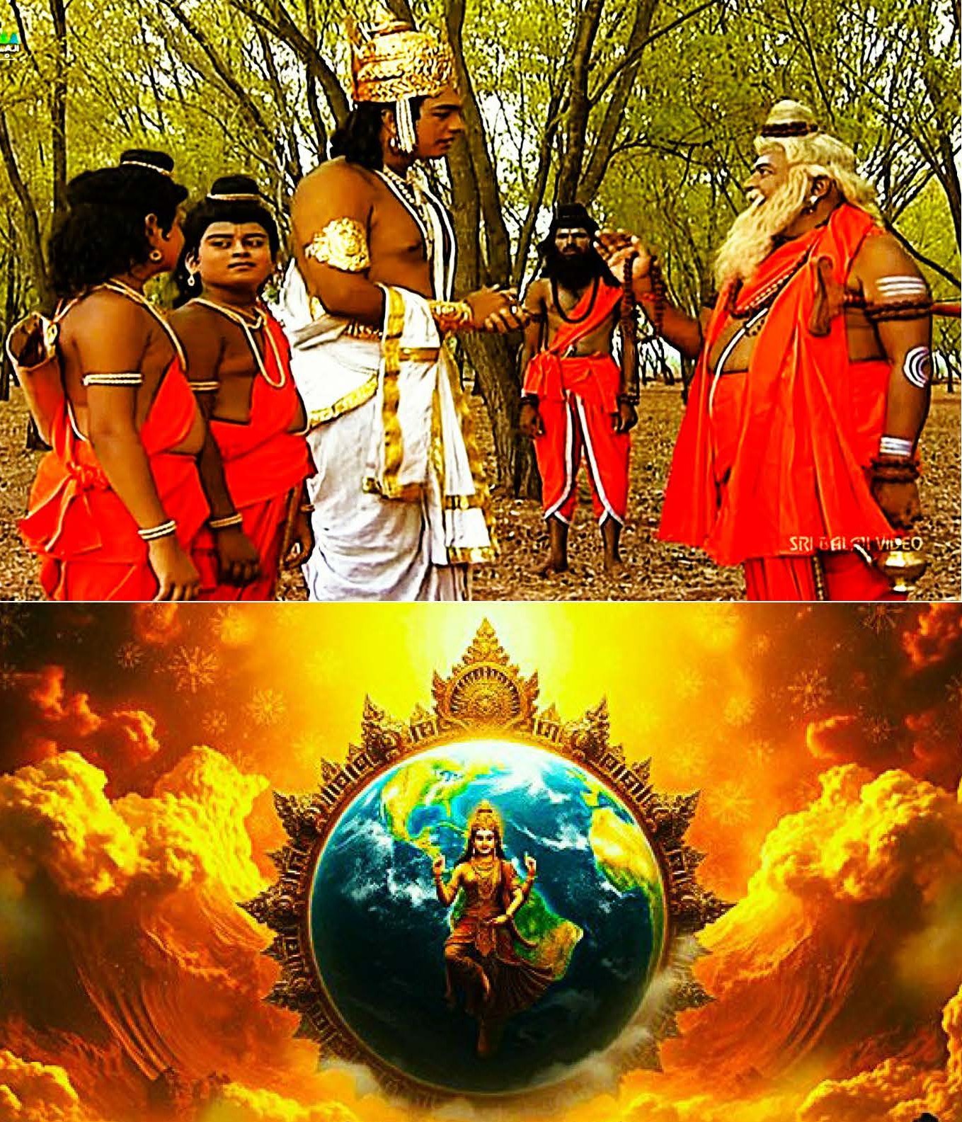 Photo Top: The reconciliation of Lord Rama with his twin children. Kuska and Lava, as Facilitated by Sage Maharishi Valmiki. The children stood by their mother during her second exile by Rama. However, at that point Sita Devi, begged Goddess Bhumi Devi, Mother Earth, to appear and take her into her domain.