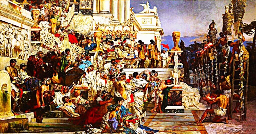 Nero’s Torches (Polish: Pochodnie Nerona) is an 1876 oil-on-canvas painting by the Polish and Russian artist Henryk Siemiradzki. It is also known as Candlesticks of Christianity (Świeczniki chrześcijaństwa). It depicts a group of Early Christian martyrs who are about to be burned alive as the alleged perpetrators of the Great Fire of Rome, during the reign of emperor Nero in 64 AD. People from many different social spheres, including the emperor himself, are present to watch the burning, which takes place in front of the Domus Aurea. The motif is based on the descriptions by Suetonius and Tacitus of the torture of Christians, such as the following:Mockery of every sort was added to their deaths. Covered with the skins of beasts, they were torn by dogs and perished, or were nailed to crosses, or were doomed to the flames and burnt, to serve as a nightly illumination, when daylight had expired. Nero offered his gardens for the spectacle, and was exhibiting a show in the circus, while he mingled with the people in the dress of a charioteer or stood aloft on a car. Of note is that the signs attached to the feet of the condemned list their alleged crimes, and show the Alexamenos Graffito.