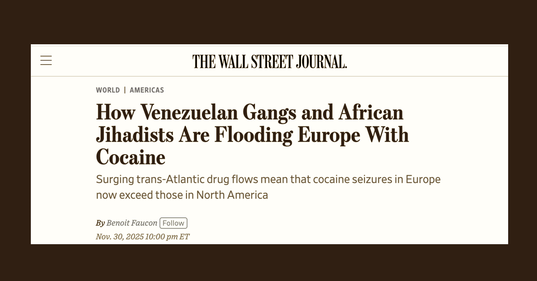 2 Dec 2025 – Just as the news breaks that Trump has issued Maduro an ultimatum to leave Venezuela immediately if he wants to escape with his life, the Murdoch-owned Wall Street Journal has published an amazingly brazen war propaganda piece titled “How Venezuelan Gangs and African Jihadists Are Flooding Europe With Cocaine.”