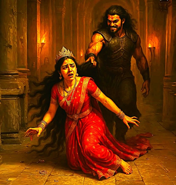 Washantran of Draupadi, dragging the Princess by her long, lustrous hair, to the royal court for disrobing, in public: A gross form of GBV in antiquity. Photo Credit: Premium AI