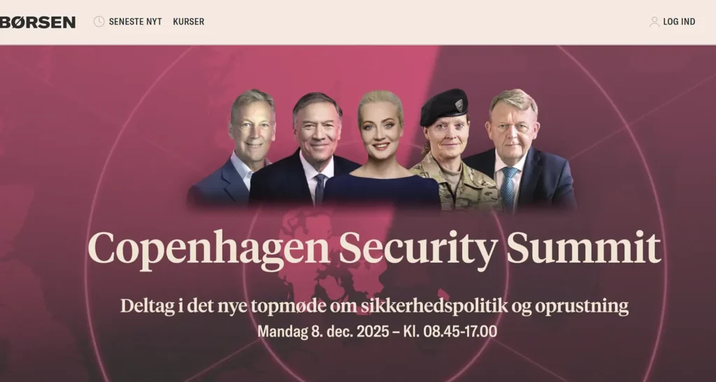 7 Dec 2025 – On 8 Dec 2025, the Copenhagen Security Summit convenes at Falkoner Centret in Frederiksberg. With 35 speakers and more than 1,200 participants, it is one of Denmark’s largest gatherings on geopolitics and security. Organised by Danish Industry (DI), Ernst and Young, Poul Schmith (The Chamber Attorney), Danske Bank, and the business newspaper Børsen, the summit features high‑profile figures such as Yulia Navalnaya, Mike Pompeo, and Lars Løkke Rasmussen.