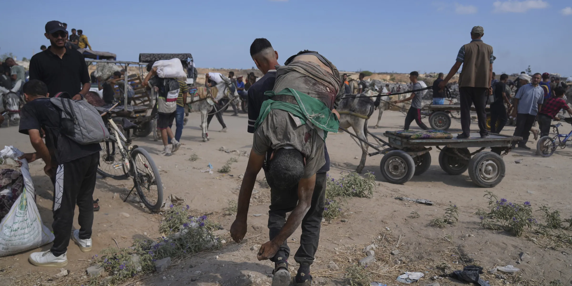A Palestinian carries the body of a man killed while trying to receive aid near a distribution center operated by the U.S.-backed Gaza Humanitarian Foundation in Netzarim, in the Gaza Strip, on 4 Aug 2025.