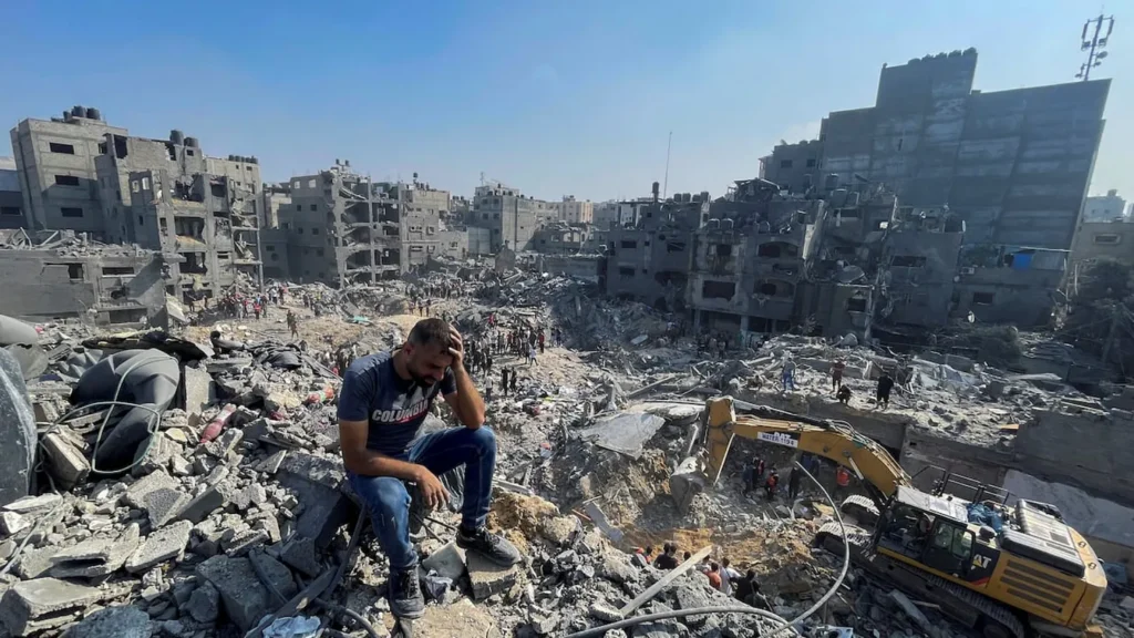 Palestinians walk among tons of piles of rubble in the northern Gaza Strip on 19 Nov 2025, consequence of Israeli genocidal destruction. [Mahmoud Issa/Reuters]