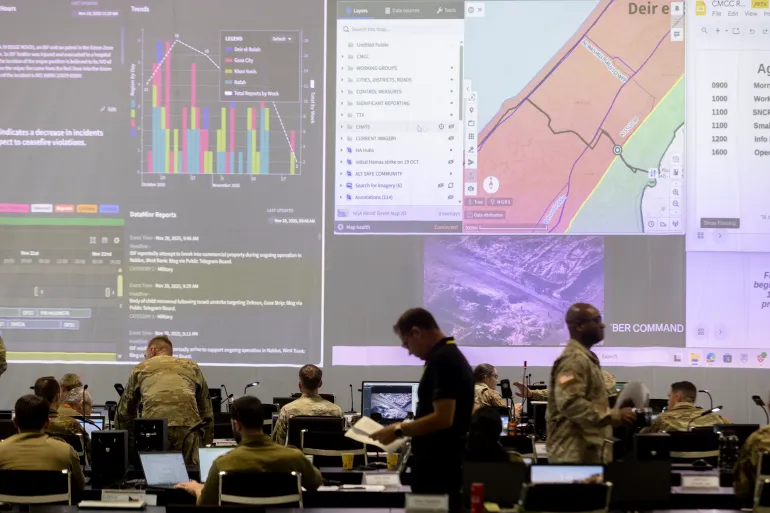 US Army personnel, Israeli military personnel and other international officials monitor screens displaying maps and imagery of the Gaza Strip during a media tour inside the Civil-Military Coordination Center (CMCC) on 20 Nov 2025 in Kiryat Gat, Israel. [Amir Levy/Getty Images]