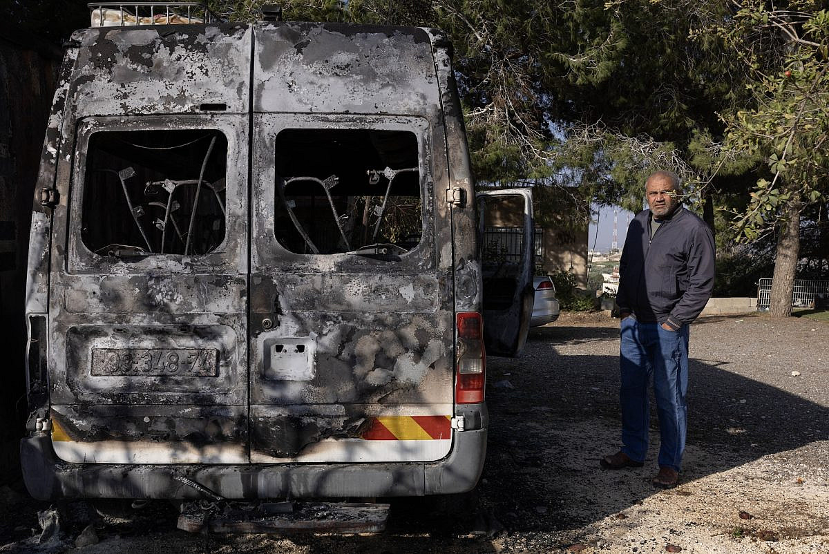 Ahmad Mousa Al-Mash’ala next to a van torched by Israeli settlers during an arson attack in the West Bank village of Jaba, 18 Nov 2025. (Oren Ziv)