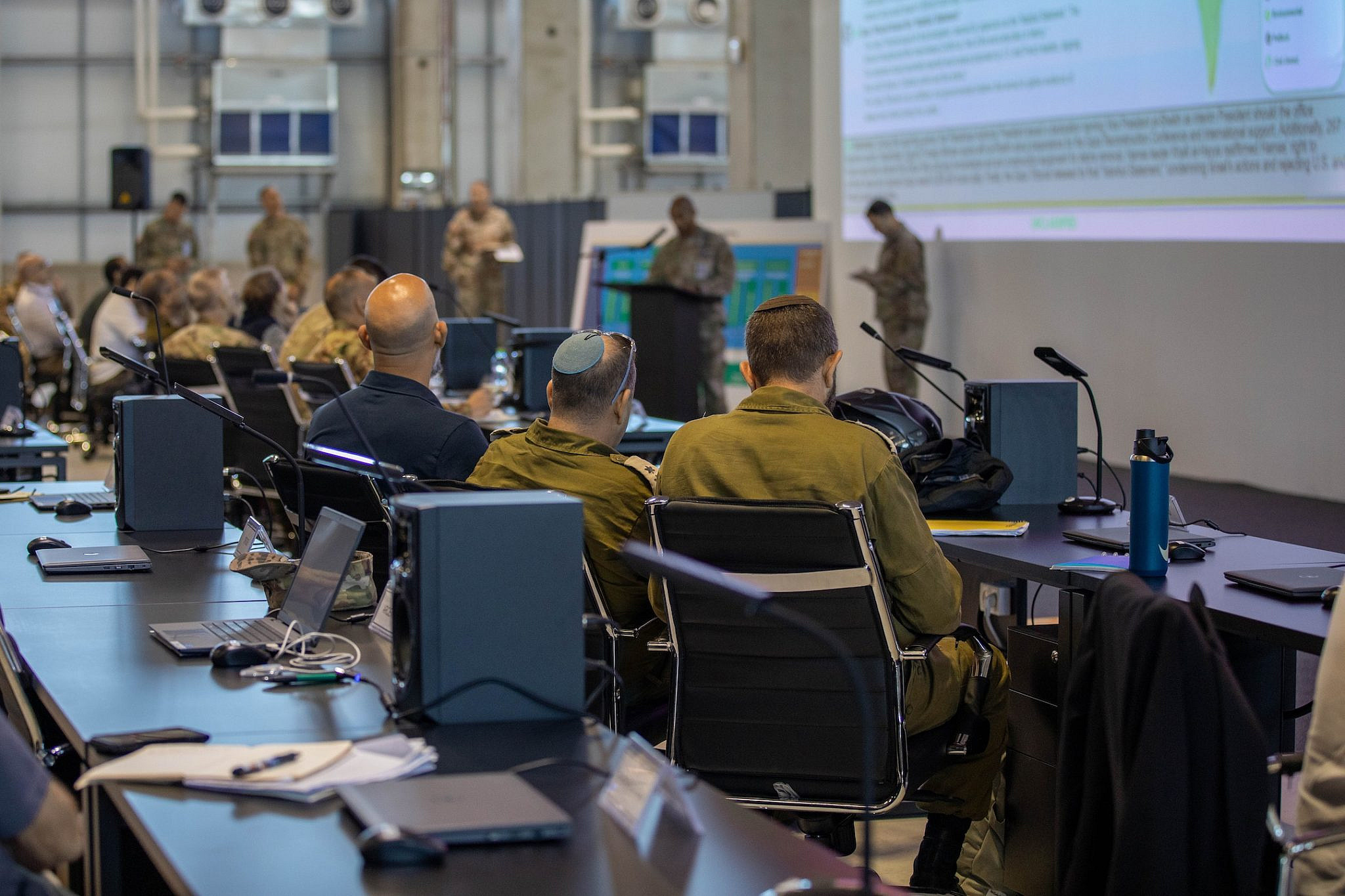 Israeli military personnel listen as U.S. Army soldiers discuss civil-military operations, at the Civil-Military Coordination Center in Kiryat Gat, southern Israel, 28 Oct 2025.