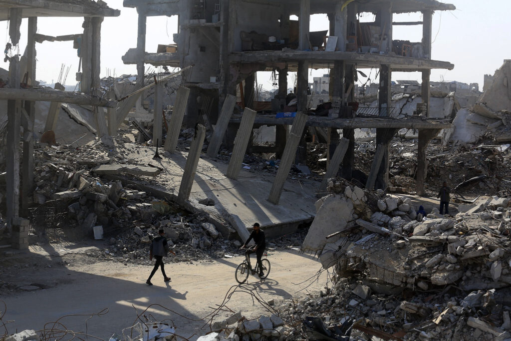 Palestinians walk among buildings destroyed during the war, in Khan Younis, in the southern Gaza Strip, 24 Nov 2025. (Abed Rahim Khatib/Flash90)