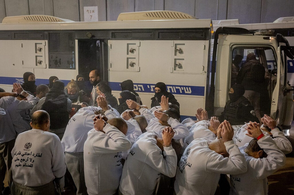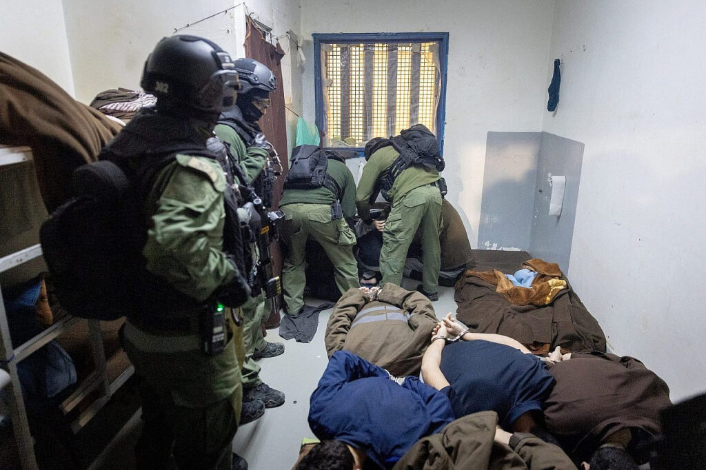 Israel Prison Service officers prepare Palestinian prisoners for release as part of a hostage deal between Israel and Hamas, at Ketziot Prison in southern Israel, 26 Feb 2025.