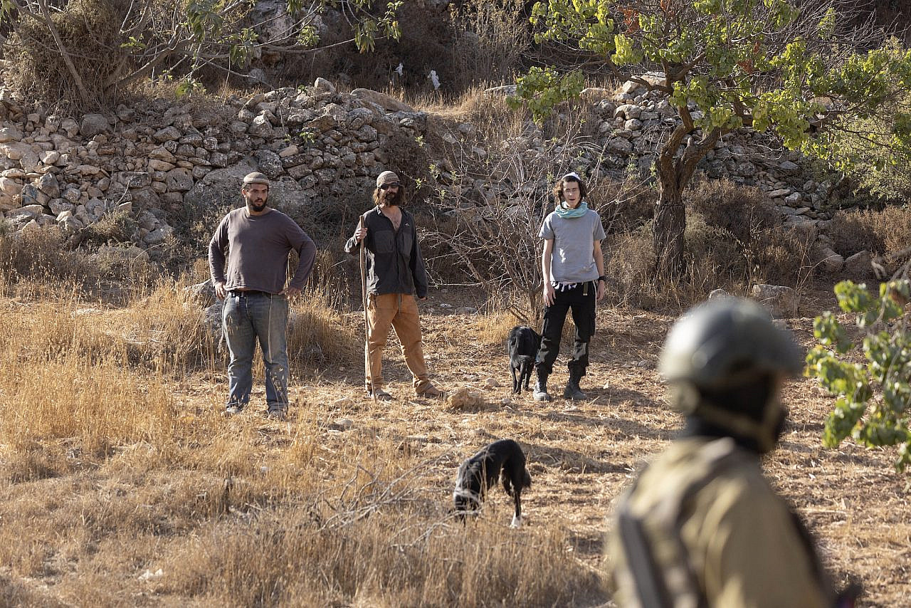 Israeli settlers from an outpost near the village of Sa’ir approach Palestinian farmers who have been harvesting olives, in the occupied West Bank, 23 Oct 2025. (Oren Ziv)