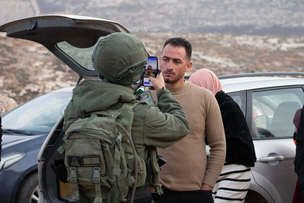 An Israeli soldier photographs Palestinian activist Rabia Abu Naim in Al-Mughayyir, occupied West Bank. (Avishay Mohar/Activestills)
