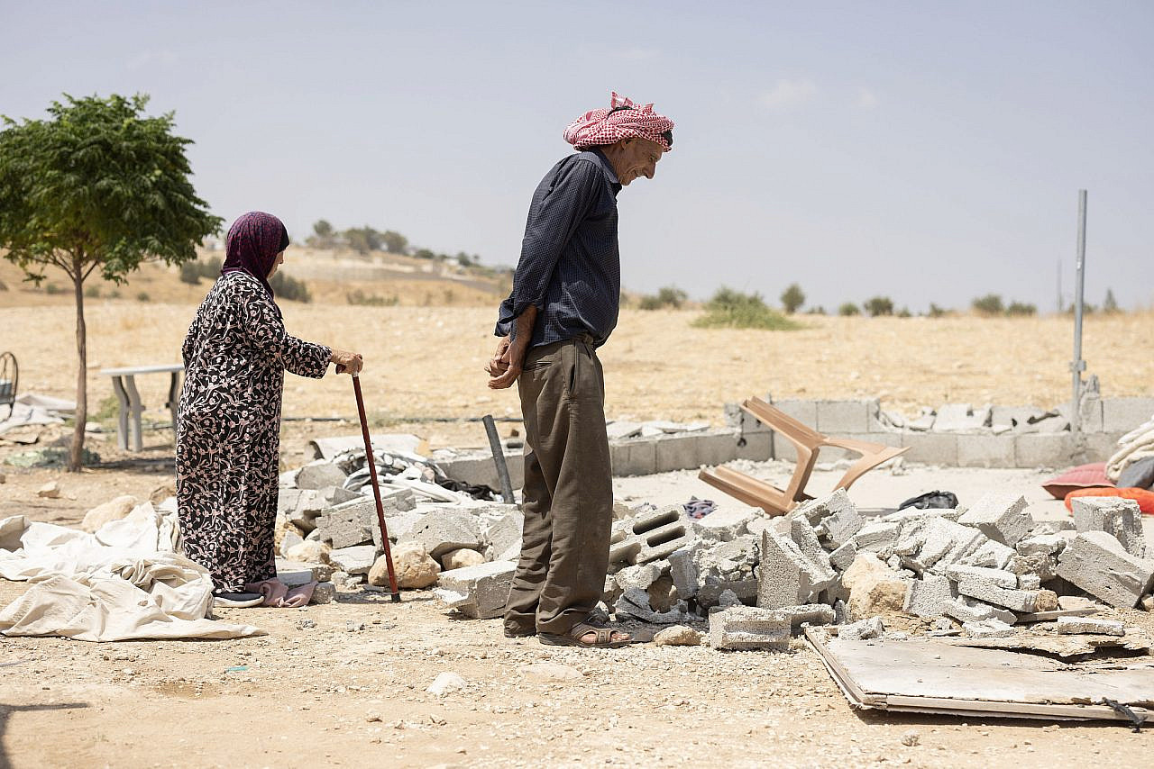 Former residents of the village of Khalet Khader inspect the destruction left by Israeli settlers, Jordan Valley, occupied West Bank. (Oren Ziv)