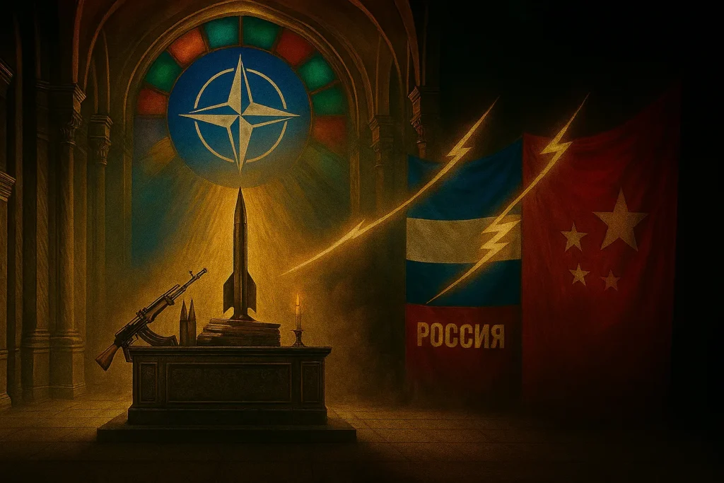 Inside NATO’s cathedral of fear, weapons become sacraments and projection becomes liturgy. From the stained-glass altar, thunderous light strikes Russia and China — not as analysis, but as ritual. This is not about Putin. It is about the West’s collapse into psycho-political theatre.
