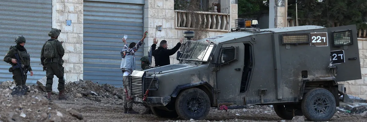 Israeli soldiers detain Palestinians during a raid in the Jenin refugee camp in the occupied West Bank on 27 Nov 2025. (Photo by Zain Jaafar/AFP via Getty Images)