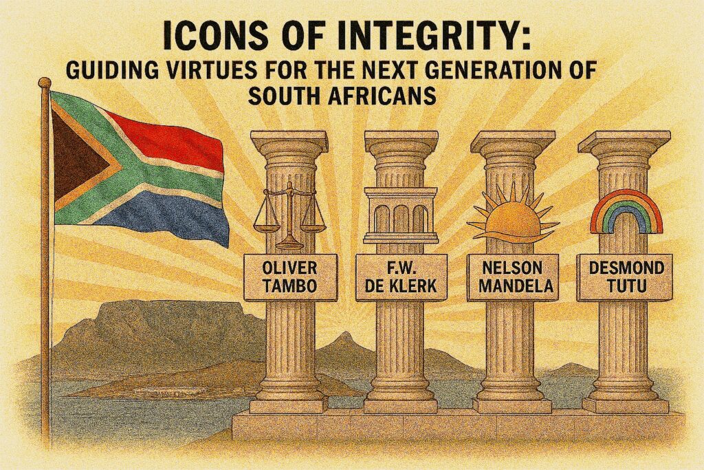 A symbolic tableau presenting four cardinal virtues, Justice and Steadfastness; Transition and Bridge‑Building; Reconciliation and Courage; Moral Clarity and Compassion, cast as classical pillars set before the iconic panorama of Table Mountain, with Robben Island solemnly occupying the foreground. In refraining from depicting individuals, the composition emphasises values rather than personalities, inviting the viewer to contemplate the ethical architecture upon which the post‑apartheid nation was rebuilt. The landscape itself becomes a moral geography: Robben Island embodies the crucible of suffering, Table Mountain rises as a metaphor for resilience, and the South African flag anchors the vision in shared nationhood.