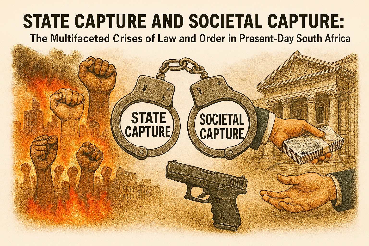 A conceptual illustration depicting the dual processes of state capture and societal capture in present‑day South Africa. The imagery contrasts elite‑level corruption, characterised by the manipulation of public institutions, diversion of state resources, and erosion of constitutional governance, with the broader societal consequences, including rising lawlessness, community insecurity, and the normalisation of criminality. Together, these interlinked dynamics demonstrate how the weakening of state structures simultaneously empowers criminal networks and undermines societal cohesion, creating a multifaceted crisis of law and order with profound implications for governance, public trust, and national stability.