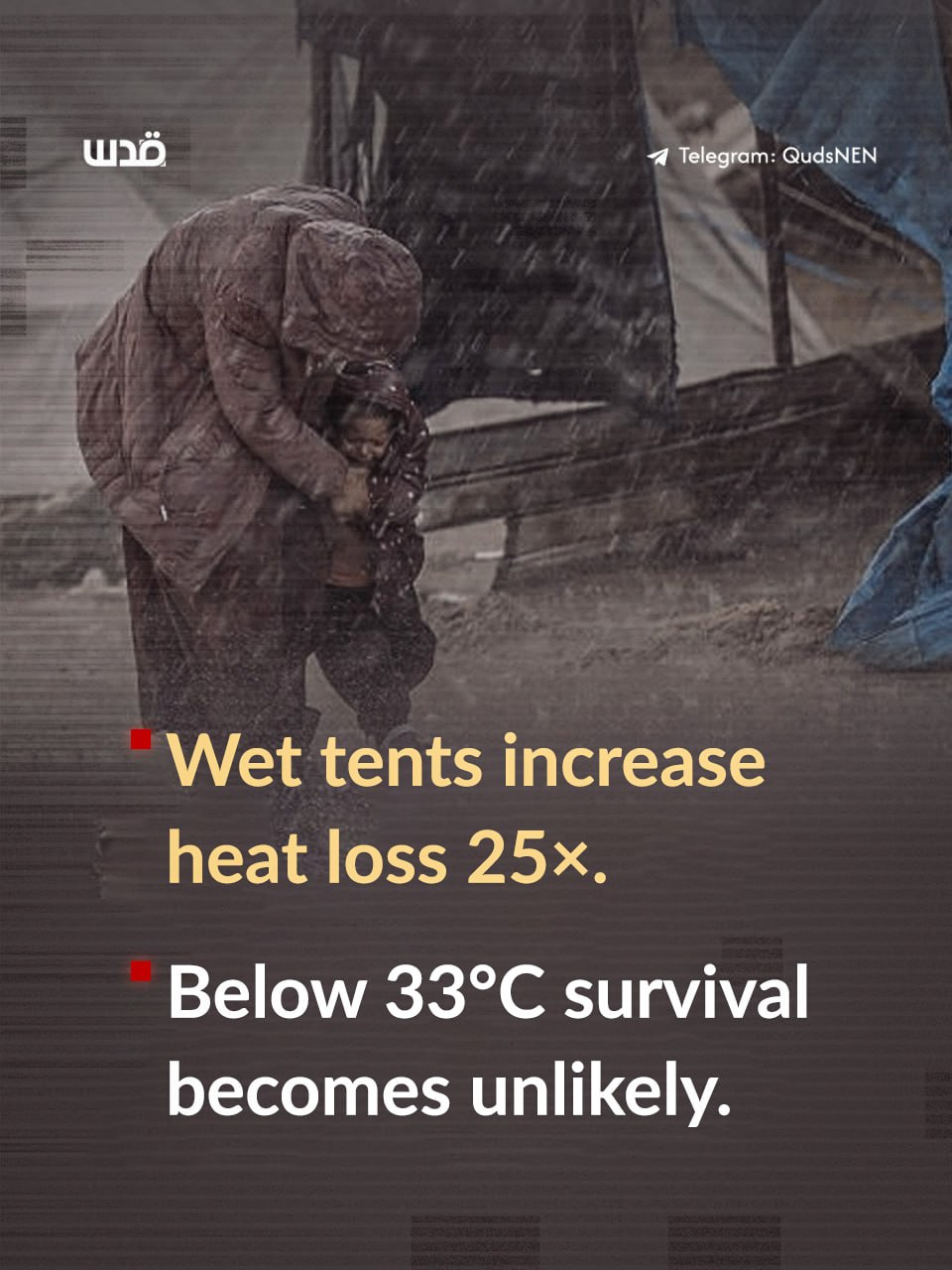 When exposed to cold, the body initially shivers to generate heat. In wet conditions, common in Gaza’s coastal camps, heat loss accelerates dramatically.