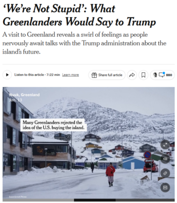 New York Times (1/14/26): “Greenlanders are trying to insert themselves into the discussions about their future before it’s too late.”