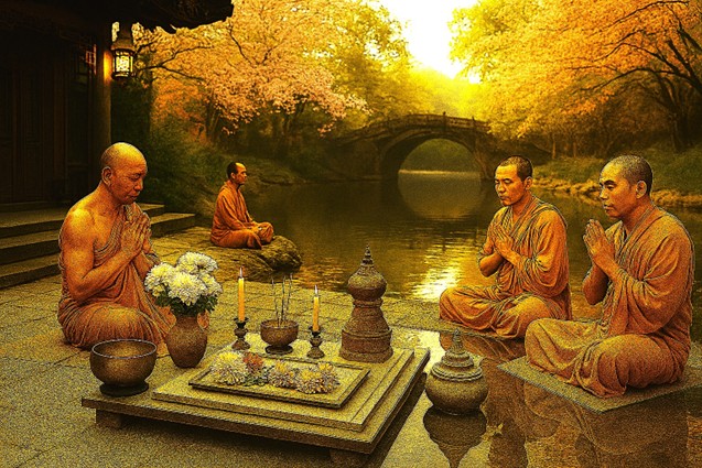 “A serene riverside courtyard becomes a sanctum of contemplation, where saffron-robed monks gather around a ceremonial altar adorned with flowers, incense, and sacred objects. The calm river mirrors the golden hues of sunrise and the arch of a stone bridge, while drifting cherry blossoms evoke impermanence—a central tenet of Buddhist philosophy. This tranquil tableau embodies the harmony between nature and spiritual practice, inviting the observer into a meditative state of inner stillness.”