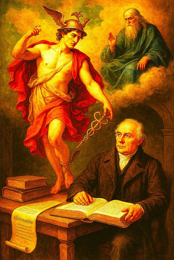 At the centre stands Hermes, the messenger god, whose winged helmet and caduceus signify velocity, mediation, and eloquence. In mythic imagination, Hermes traverses boundaries, celestial, terrestrial, and subterranean, embodying the interpreter’s vocation to move between horizons without dissolving their difference. His presence underscores the indispensability of mediation in any interpretive act: meaning does not leap unassisted from source to recipient; it is carried, translated, and tactfully reframed. The drapery’s crimson and gold harmonize authority with illumination, suggesting that genuine understanding is both a gift bestowed and a discipline cultivated, never merely a passive reception.