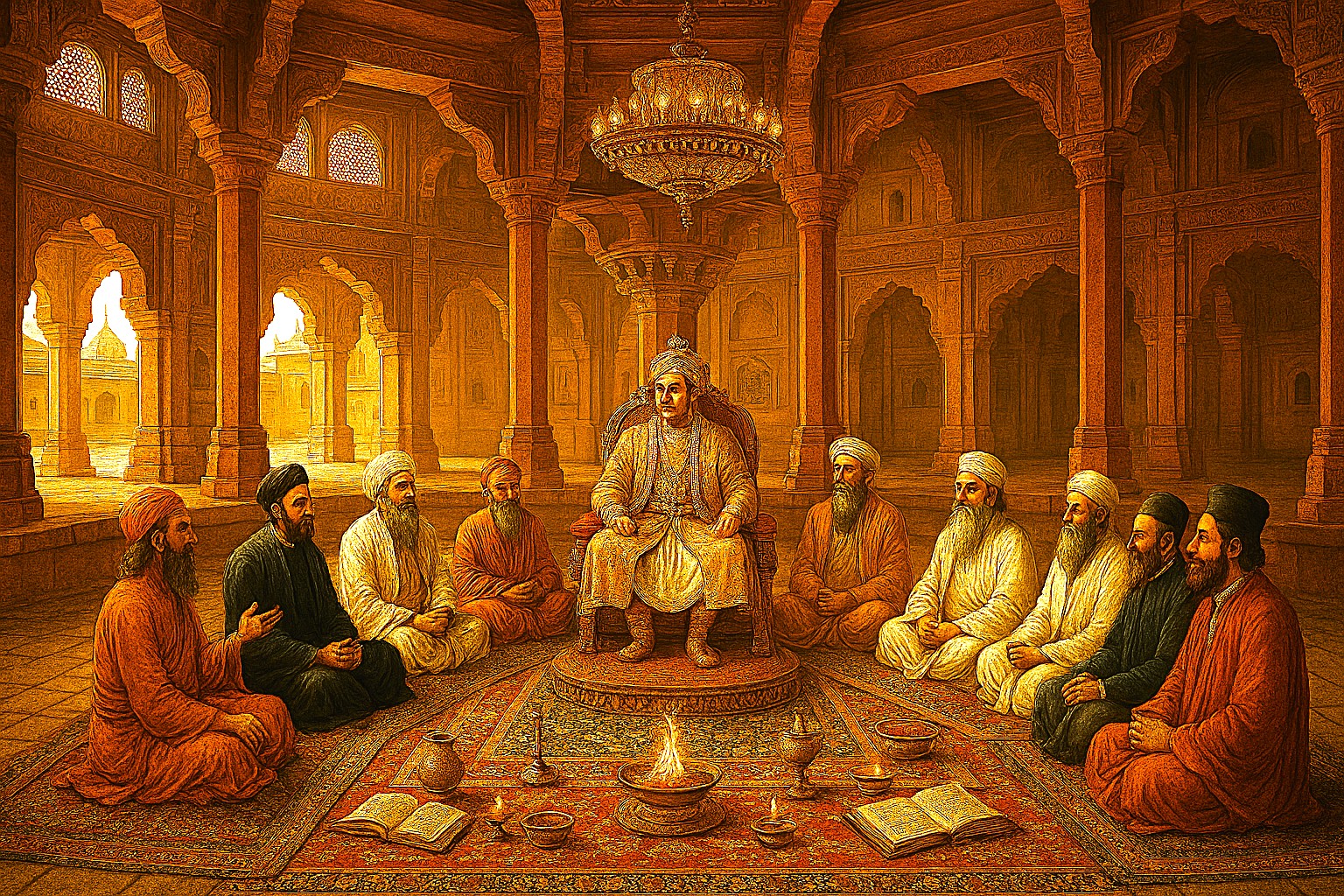 “Within the opulent hall of Fatehpur Sikri, the Mughal Emperor Akbar presides over a gathering that transcends the boundaries of creed and culture. This architectural marvel, adorned with red sandstone arches, intricate jali screens, and a resplendent chandelier,becomes the sanctum of intellectual and spiritual exchange. At its center, Akbar occupies an elevated seat, symbolizing impartial authority and the axis of a wheel whose spokes radiate toward the diverse spiritual luminaries encircling him.