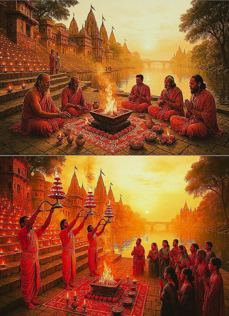 “On the sacred ghats of Varanasi, the havan ritual unfolds at dawn—a timeless invocation of divine energy through fire. Flames rise from the kund, encircled by marigold garlands and brass vessels filled with ghee and herbs, symbolizing purity and cosmic offering. Maharishis chant Vedic mantras, their oblations sanctifying the space where earth, water, fire, air, and ether converge. The River Ganges, shimmering under the golden light, reflects the eternal dialogue between humanity and the divine.”
