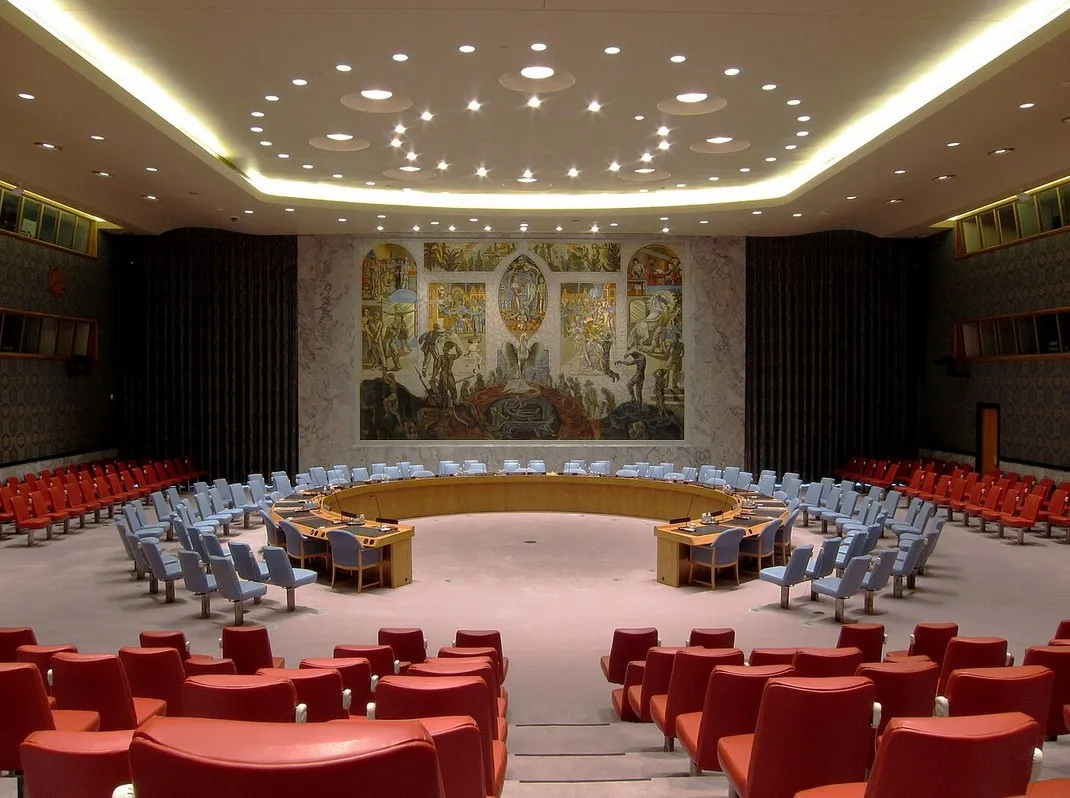 The empty UN Security Council Chamber in New York City (Wikipedia)