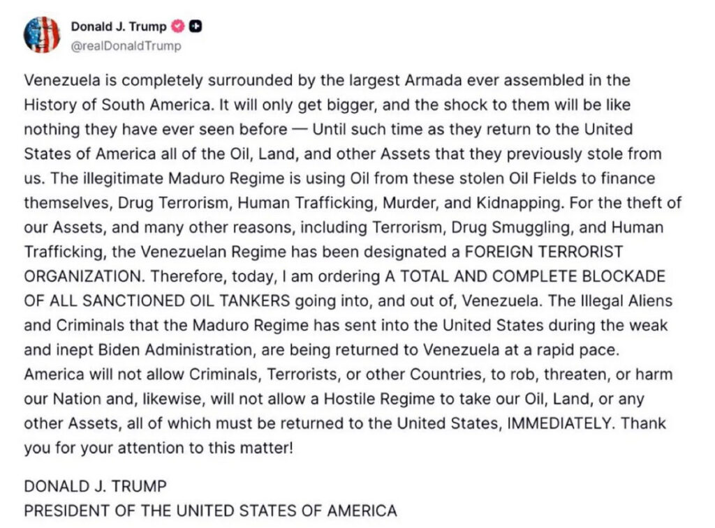 On Dec. 16, Trump posted on Truth Social that he was ordering “A TOTAL AND COMPLETE BLOCKADE” of all Venezuelan oil tankers by “the largest Armada ever assembled” until “such time as they return to the United States of America all of the Oil, Land, and other Assets that they previously stole from us.”