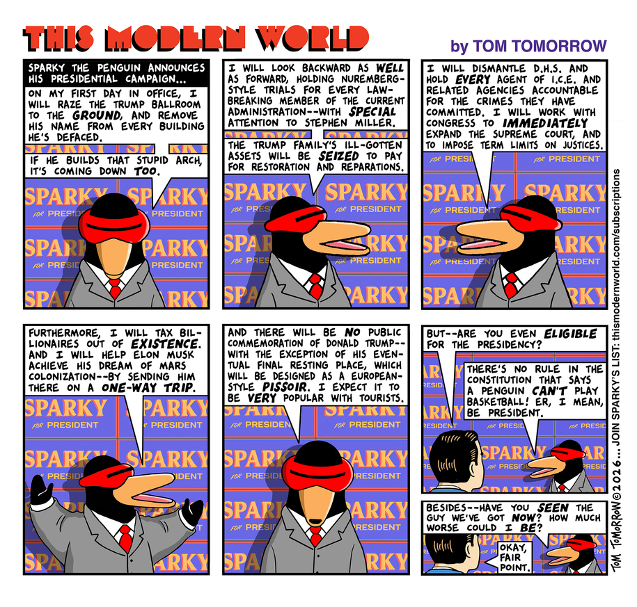 Tom Tomorrow is the pen name of editorial cartoonist Dan Perkins. His weekly comic strip, This Modern World, which comments on current events, appears regularly in more than 80 newspapers across the United States and Canada. He is a 2015 Pulitzer Prize finalist and the 2013 Herblock Prize winner. He was awarded the first place Robert F. Kennedy Journalism Award for Cartooning in 1998 and again in 2003 and is also a recipient of the Aaronsen award and a Society of Illustrators silver medal, among other honors. He is the author of ten cartoon anthologies and one children’s book, and in 2009 collaborated with the band Pearl Jam to create the artwork for their album, Backspacer. He is currently at work preparing for an absurdly ambitious Kickstarter project, with which he hopes to mark the 25th anniversary of TMW in print.