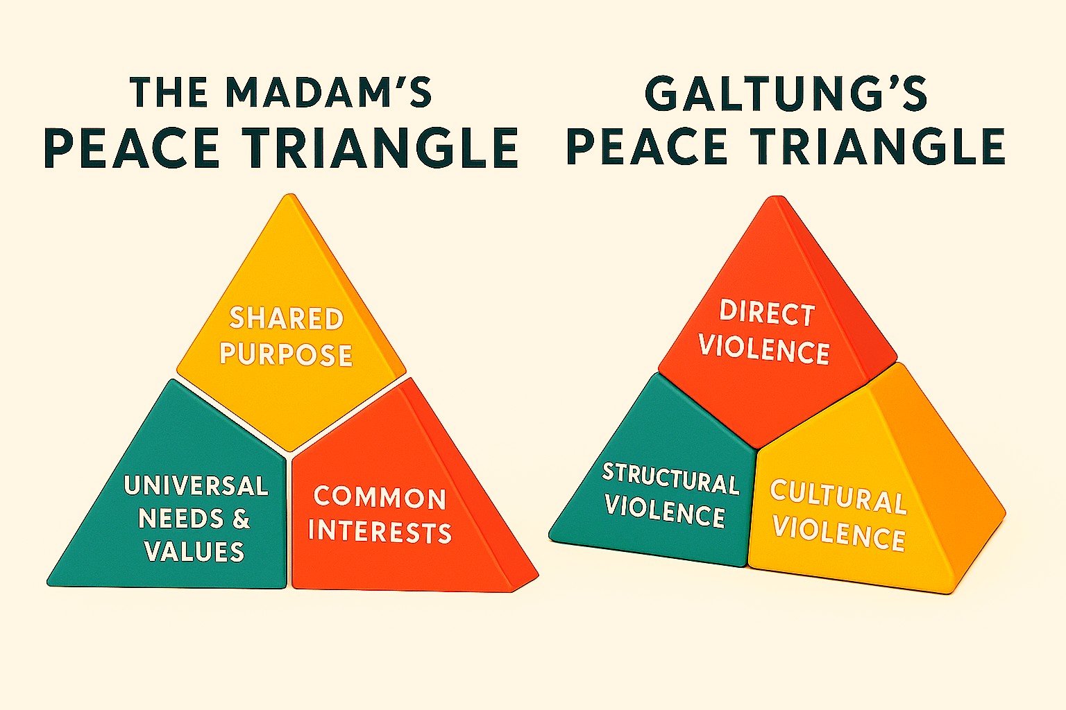 Situated within this philosophical, foundational ground, Galtung’s Peace Triangle is retained as an indispensable diagnostic instrument. By distinguishing between direct, structural, and cultural violence, Galtung’s model illuminates the systemic and symbolic drivers of conflict that must be dismantled for sustainable peace to emerge. It is important to remember that diagnostics alone cannot generate peace. This paper therefore integrates The Madam’s Peace Triangle, centred on Shared Purpose, Universal Needs and Values, as well as Common Interests, as a design engine for constructing peace through enabling attitudes, constructive behaviours, and inclusion‑focused policies. Where Galtung clarifies the machinery of harm, The Madam’s Triangle clarifies the architecture of alignment.
