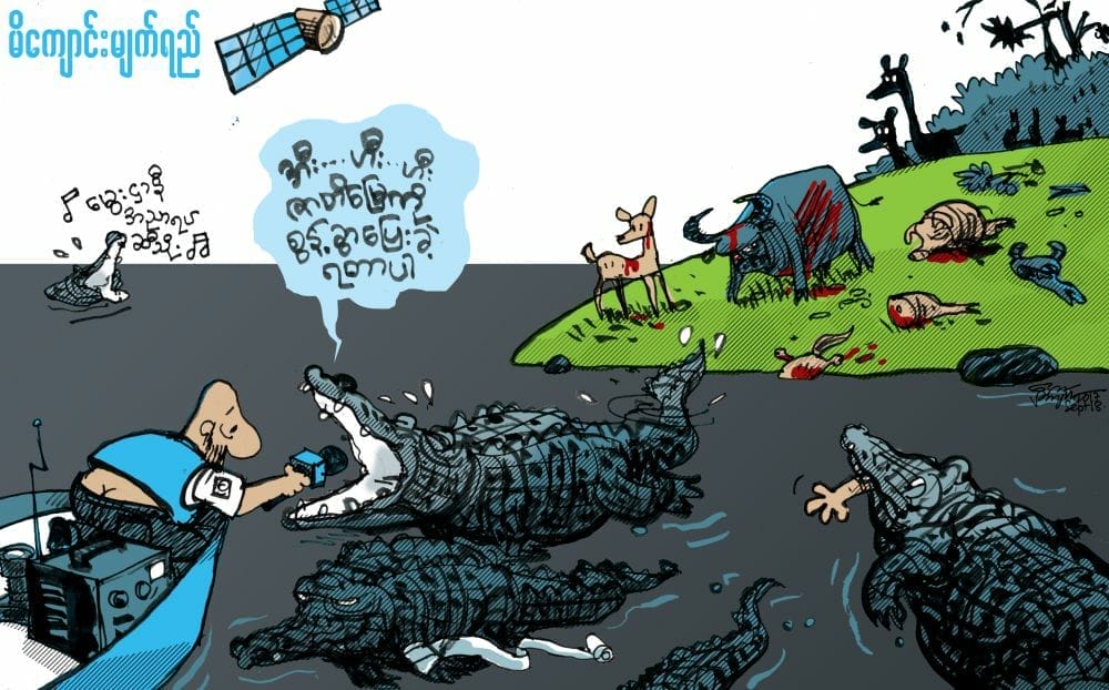 Myanmar’s pro-democracy intelligentsia including journalists supported the military’s genocide against Rohingya people, falsely portraying the victims as “illegal aliens”. Amidst the genocidal campaign in Rakhine State, Western Myanmar, the influential Irrawaddy News with millions of Myanmar followers published multiple news reports and cartoons such as these two.