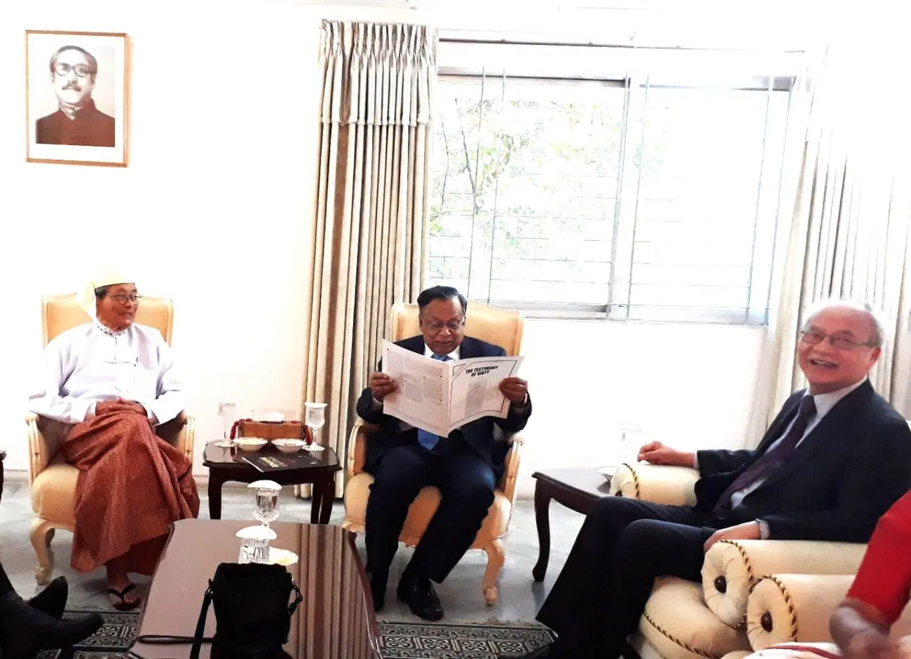 Harn, on the far right, laughing at the photographer’s joke, with retired Professor U Kyaw Win (left, in Burmese attire), author of My Conscience: An Exile’s Memoir of Burma (2016) and Mr Abul Hassan Mahmood Ali, the then Foreign Minister of Bangladesh, at the Government House, Dhaka, 29 Nov 2017. Both Harn and U Kyaw Win were there as official guests of the FM to discuss Myanmar’s genocide of Rogingyas who became refugees in Bangladesh, before travelling on to Cox’s Bazaar where they went to see their fellow countrymen and woman in refugee camps.