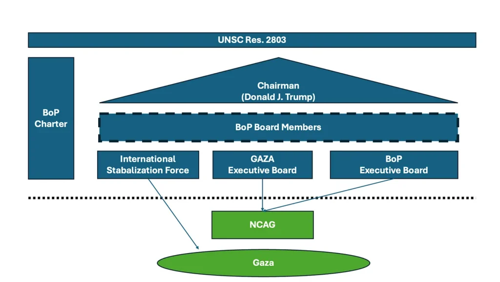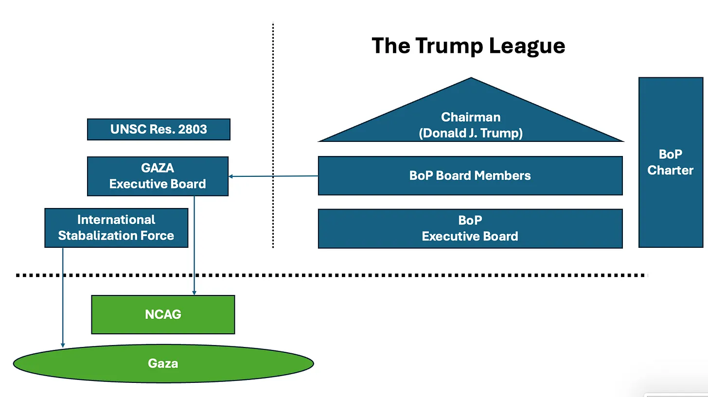 Through Trump’s executive decision-making power (as granted by the charter), the nascent BoP has created a third board to deal with Gaza separately, meaning not as part of the BoP Charter setup itself. Trump announced last weekend that a “Gaza Executive Board” shall be tasked with liaising with the newly formed “National Committee for the Administration of Gaza” (NCAG). This Palestinian technocratic body, created on January 16, is designed to administer Gaza post-conflict. Yet it enjoys no sovereignty. It is strictly an implementation partner, subordinate to the BoP’s international oversight. This is, of course, why all human rights people out there are so appalled by the entire approach of transforming Gaza into a modern-day UN protectorate—implemented through Trump’s private IO.