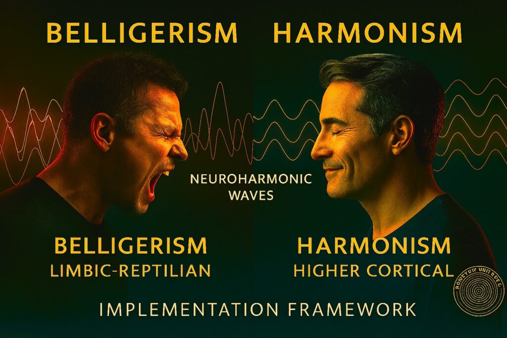 On the left, Belligerism is illustrated through desynchronised neuroharmonic waves, representing heightened activity within the limbic–reptilian complex, including structures such as the amygdala, periaqueductal grey, basal ganglia, and hypothalamus. These regions mediate rapid threat detection, impulsive reactivity, and defensive aggression, functions that correspond to heightened emotional arousal. Research in bilingual affective neuroscience demonstrates that individuals exhibit greater autonomic activation, including increased skin‑conductance responses, when processing emotionally salient content in their non‑native or foreign language (L2+), reflecting more effortful cognitive processing, reduced emotional grounding, and increased psychological distance. This decoupling contributes to desynchronised neuroharmonic patterns, a marker of reduced integrative coherence and increased susceptibility to conflict‑oriented behaviour. [saflii.org], [gov.za]