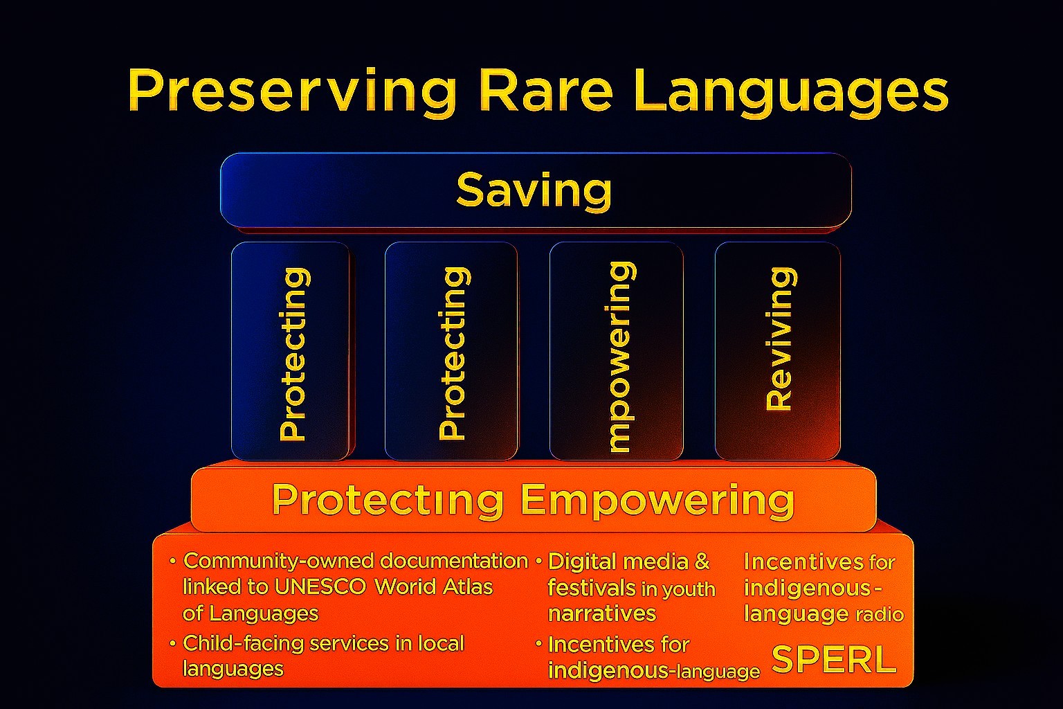 From Ubuntu emerges SPERL, a structured action framework comprising Saving, Protecting, Empowering, and Reviving Languages, anchored in national legislative duties such as the Use of Official Languages Act (2012), which mandates language policies, Language Units, and annual monitoring across departments.[46] SPERL also aligns with UNESCO’s International Decade of Indigenous Languages (IDIL 2022–2032) and its Global Action Plan, which calls for documentation, digital inclusion, education, and multi‑stakeholder governance to safeguard threatened languages. [unesco.org] [eha.eco], [Address by…nu and …]