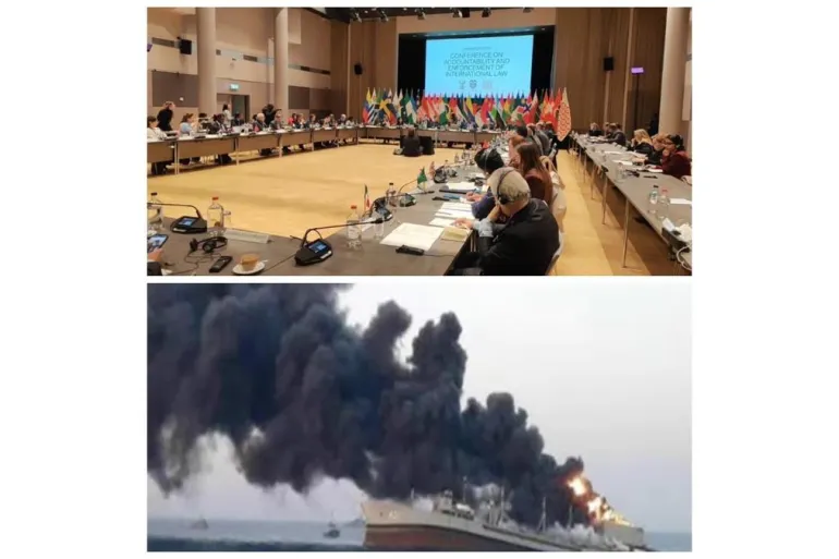 In that context, the juxtaposition of a sinking warship with an image of diplomats and experts is far more than an abstract provocation. A comparison is being made between military targets and the participants in a meeting to uphold international law.